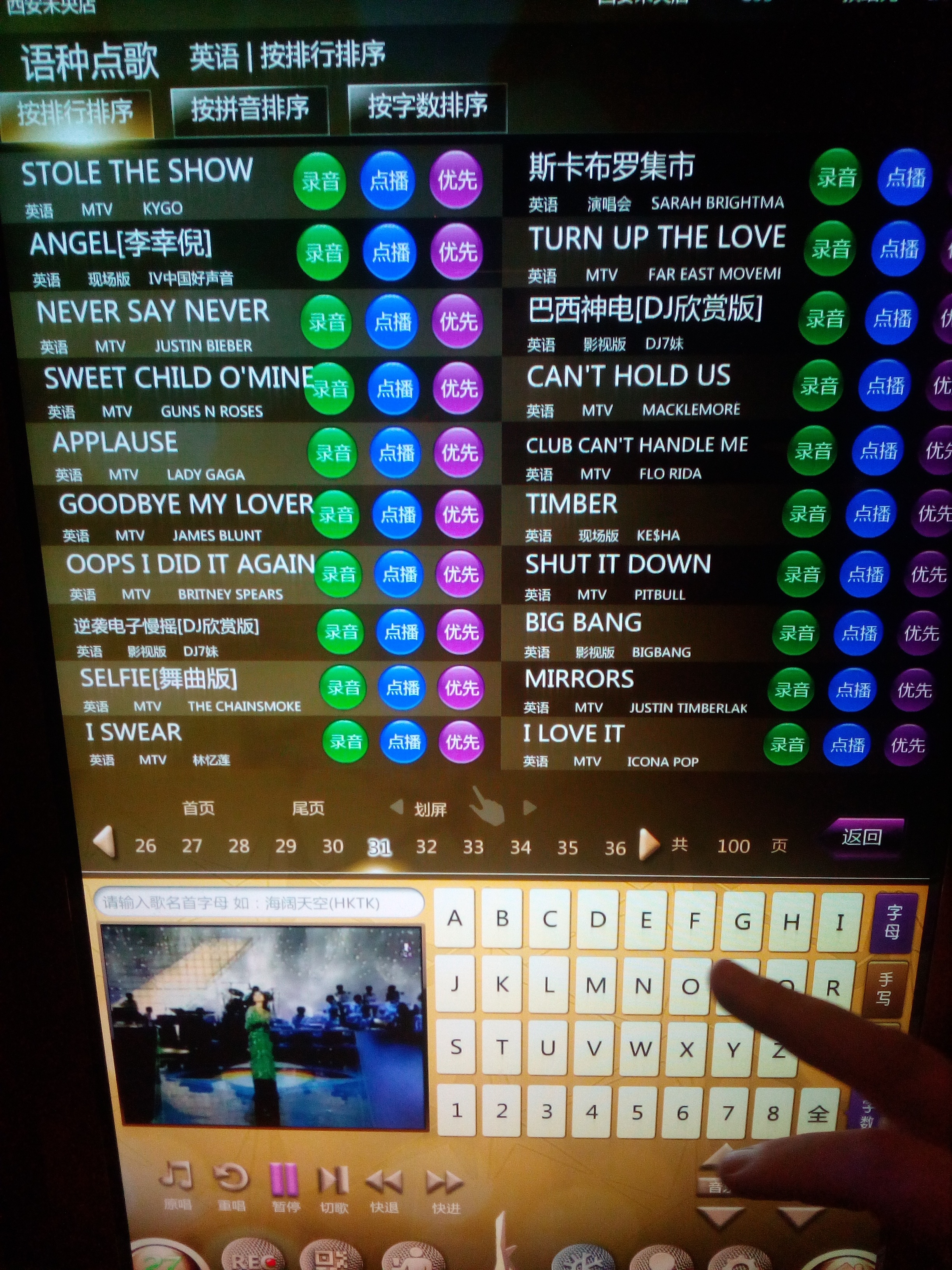 As KTV novices, we took to our experts to see how things got done. Apple ordered a round of Tsing Tao beers, along with popcorn and a few other snacks. Off to the side of the room was the jukebox, a tablet of sorts where we would first choose a country (China, England, America) and then choose a song. I was impressed with the selection of “American” songs that were available— everything from “Linger” by the Cranberries to “Sorry” by Justin Bieber.